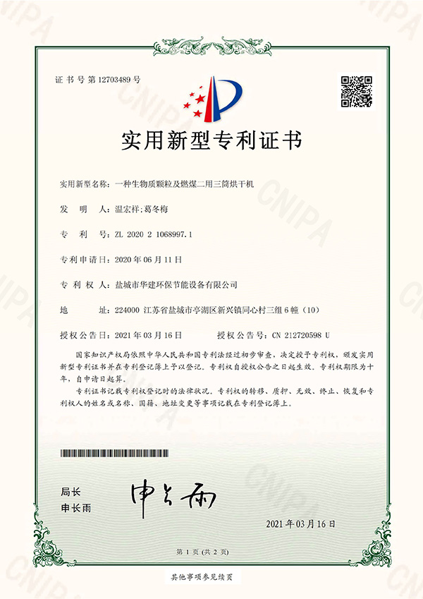 一種雙筒烘干機-實用新型專利證書